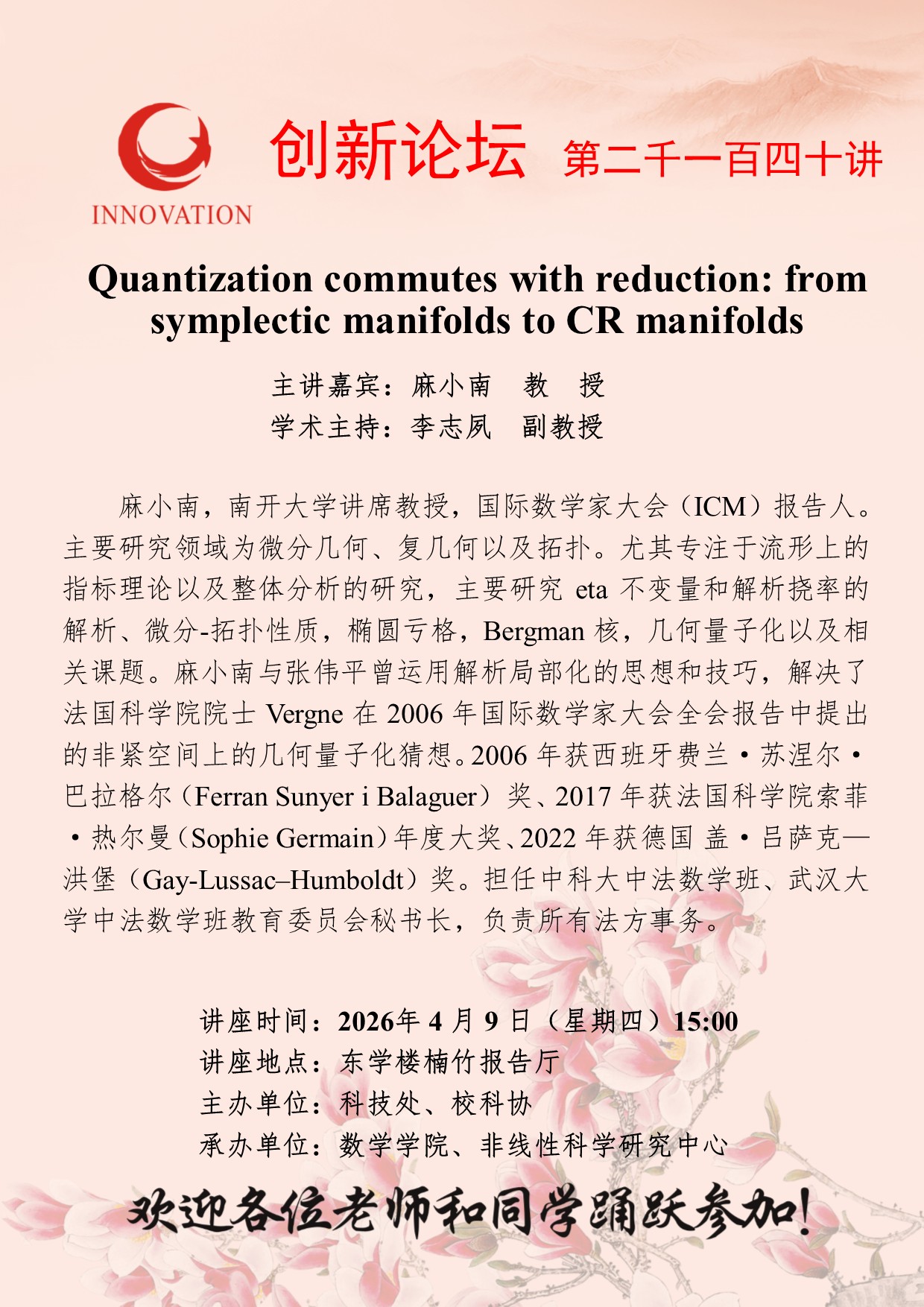 西北大学创新论坛第二千一百四十讲:Quantization commutes with reduction: from symplectic manifolds to CR manifolds